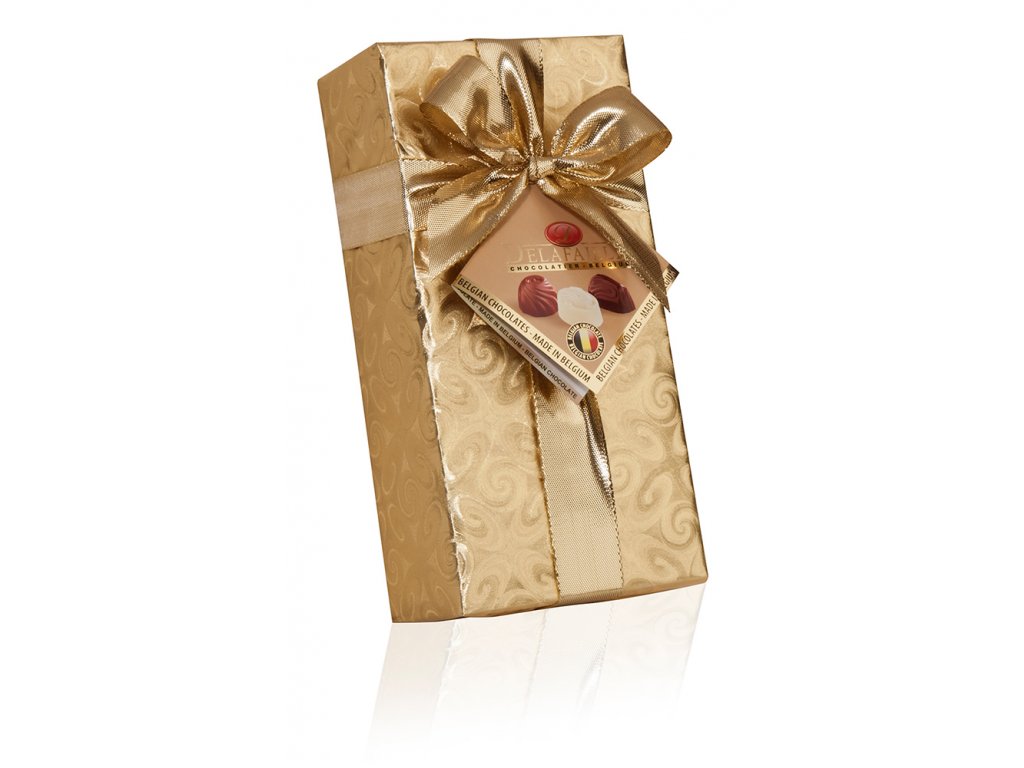 Die luxuriöse Pralinenschachtel enthält 16 gefüllte belgische Pralinen aus Vollmilch-, Zartbitter- und weißer Schokolade. Die Pralinen sind sorgfältig in einer eleganten Goldbox mit Goldband verpackt und somit ein ideales Geschenk für alle Liebhaber hochwertiger Schokolade. Sie enthält 8 Stück Vollmilchpralinen, 4 Stück Zartbitterschokolade und 4 Stück weiße Schokolade.