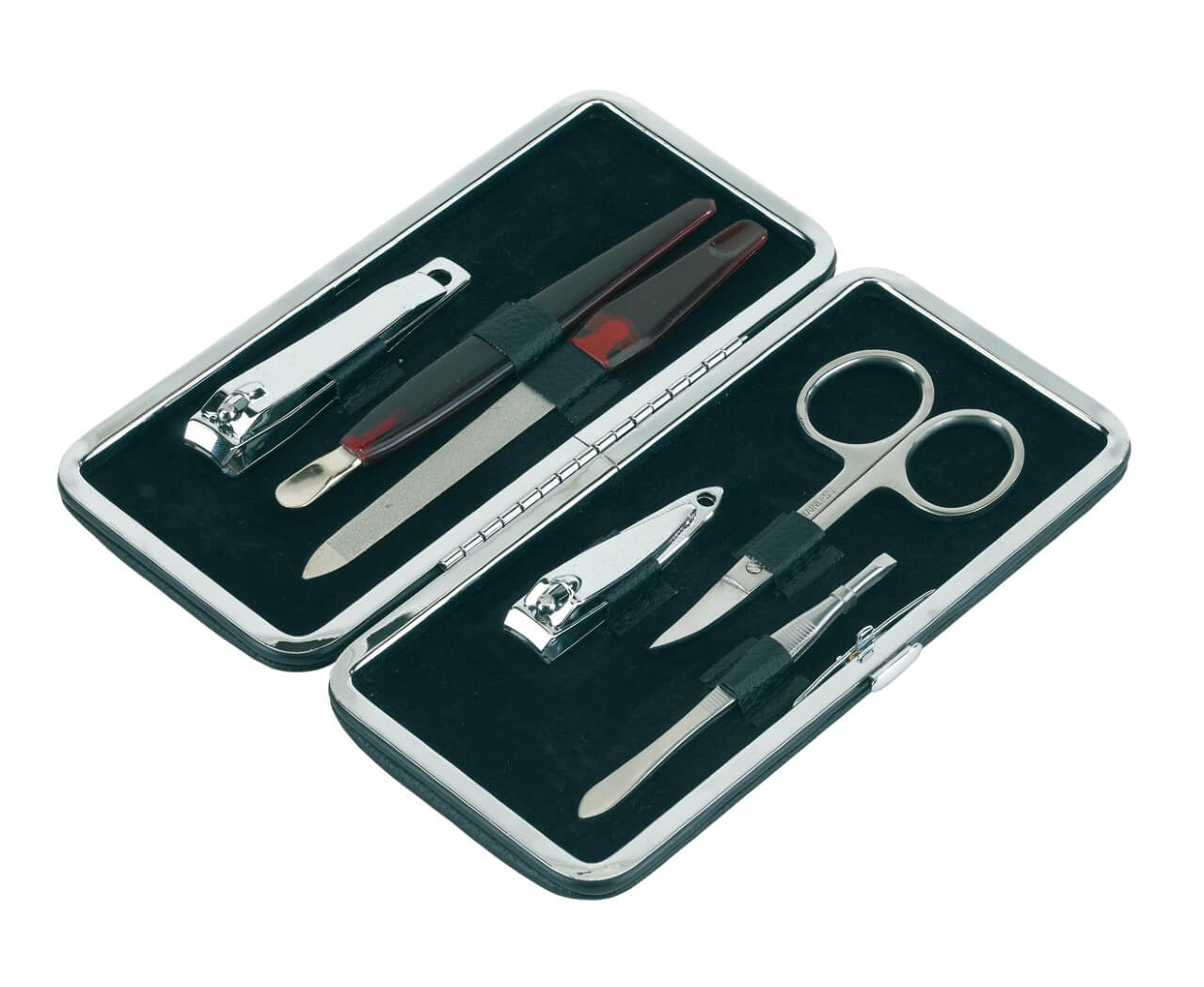 Elegantes Maniküreset "Amelie" : bestehend aus Nagelschere, Nagelfeile, Pinzette, Nagelschaber, großem und kleinem Nagelknipser, im rechteckigen Etui mit Seitknopfverschluss