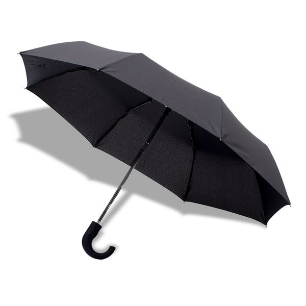 Folding umbrella with 8 panels of pongee 190T polyester with soft plastic handle and fiberglass ribs, windproof. Automatic opening. Waterproof packaging.