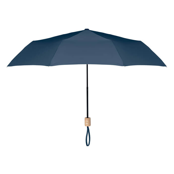 Folding umbrella with 8 panels of pongee 190T polyester with soft plastic handle and fiberglass ribs, windproof. Automatic opening. Waterproof packaging.