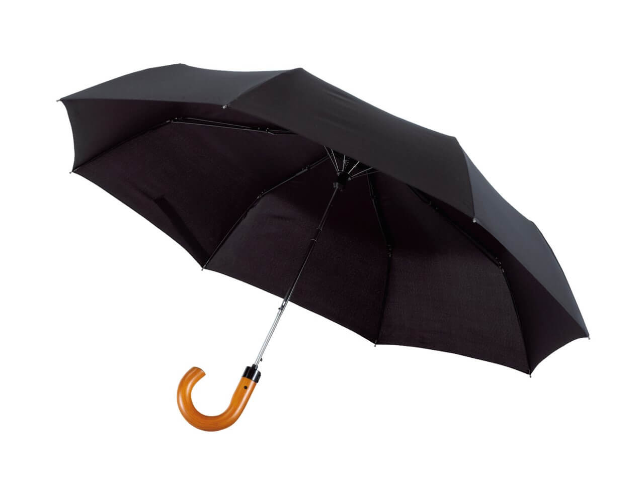 Automatický dáždnik vyrobený zo 190T polyesteru so zaoblenou drevenou rukoväťou a drevenými hrotmi.