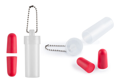 Farbige Ohrstöpsel in transparentem Kunststoffetui mit Metallkette.
