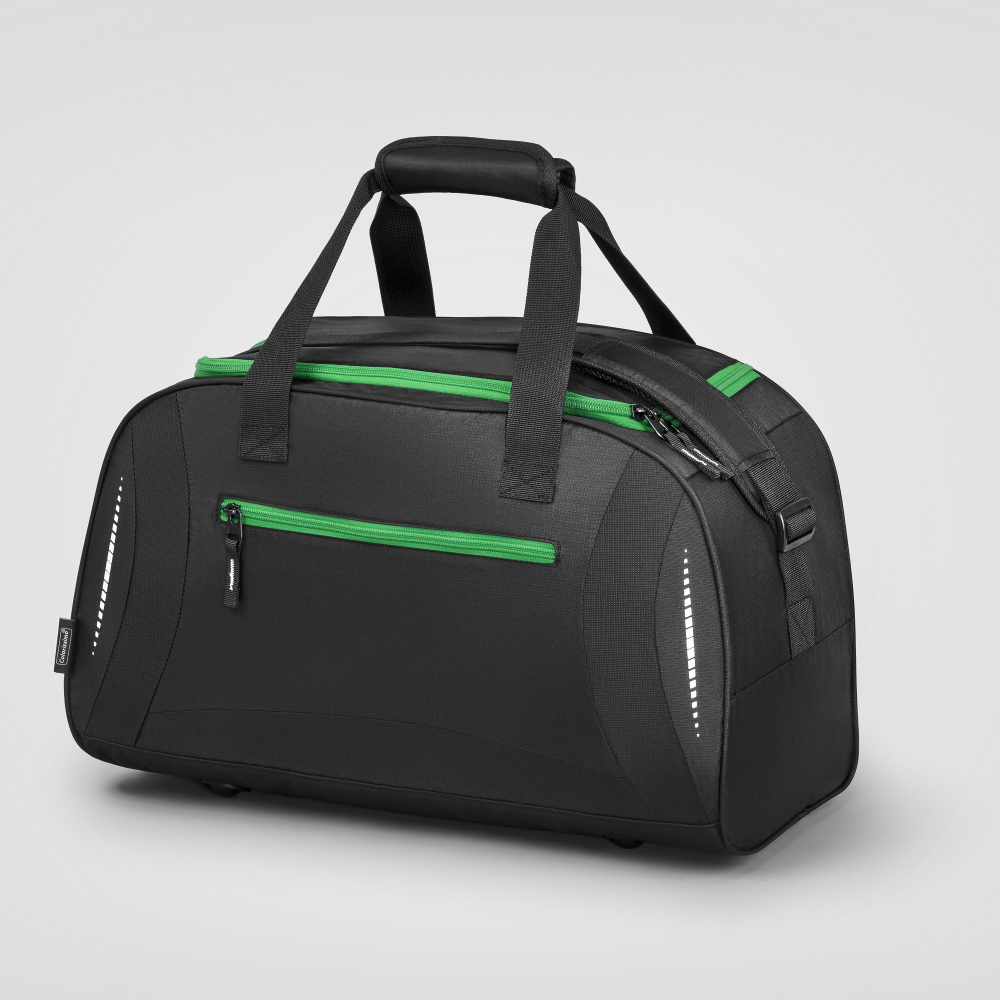 Polyester (600D) sports/travel bag with various compartments and an adjustable shoulder strap.