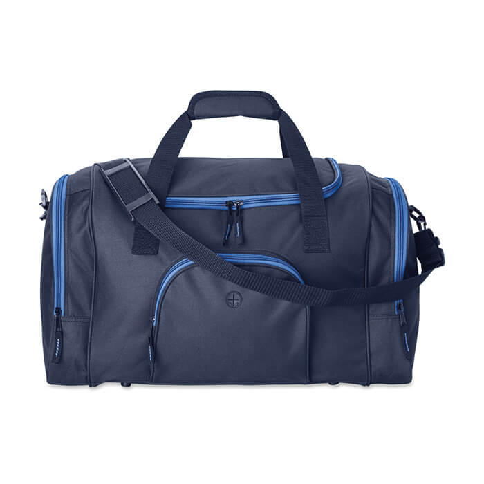 Sporttasche mit mehreren Fächern, verstellbarem Schultergurt und einer Ohrhörer-Öse. 600D Polyester.