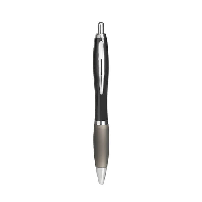Kunststoffkugelschreiber mit silbernem Schaft und farbigem Gummigriff. Mit schwarzer Mine.