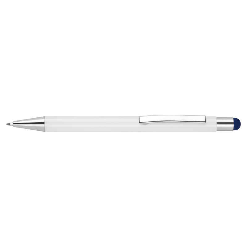 Druckkugelschreiber aus Aluminium mit silbernen Applikationen, Touch-Funktion und blauschreibender Mine.
