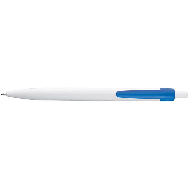 Trendiger Kugelschreiber mit Knopf und blauer Mine. Da der Stiftkörper weiß ist, wird der Farbclip noch deutlicher.