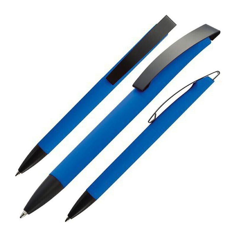 ugelschreiber aus Kunststoff mit blauschreibender Mine und gummierter Oberfläche.