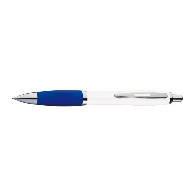 Kugelschreiber aus Kunststoff mit blauer Füllung, Metallclip und farbig gummiertem Griff. Der Körper des Stifts ist weiß.