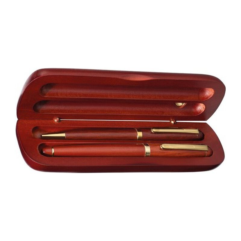 Bamboo pen set, consisting of a ballpen and rollerball pen, both with metal trim parts and supplied in a matching box. Blue ink.