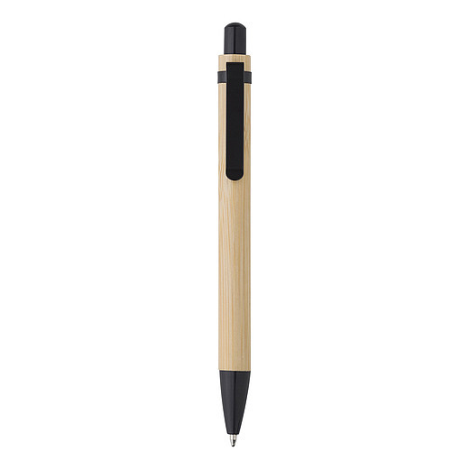 Bamboo ballpen with silver coloured tip, top, clip and band. Black ink.