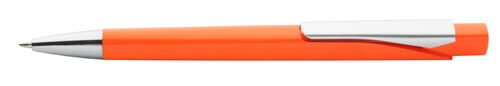 Kugelschreiber aus Kunststoff mit farbigem Schaft, gummiertem Griffstück und glänzenden Chromteilen. Mit blau schreibender Mine.