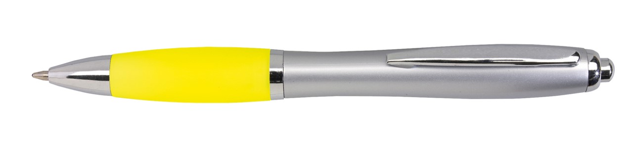 Coloured, plastic ballpoint pen with black refill.