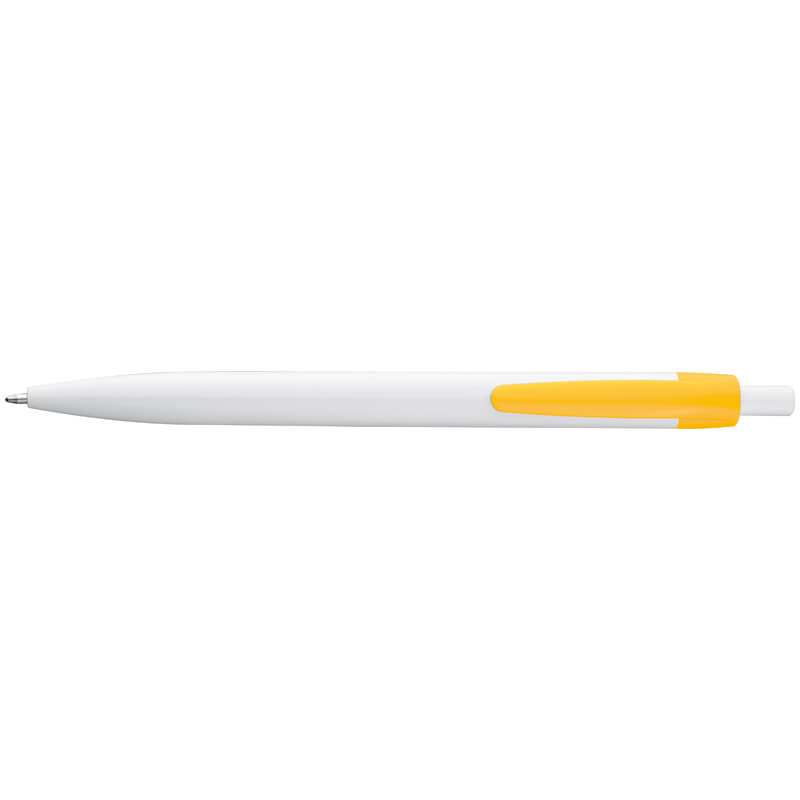 Trendiger Kugelschreiber mit Knopf und blauer Mine. Da der Stiftkörper weiß ist, wird der Farbclip noch deutlicher.