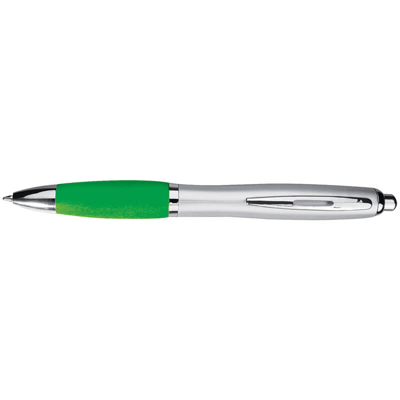 Plastové guľôčkové pero so striebornými aplikáciami, modrou náplňou, dotykovou funkciou a vzorovanou úchopovou zónou.