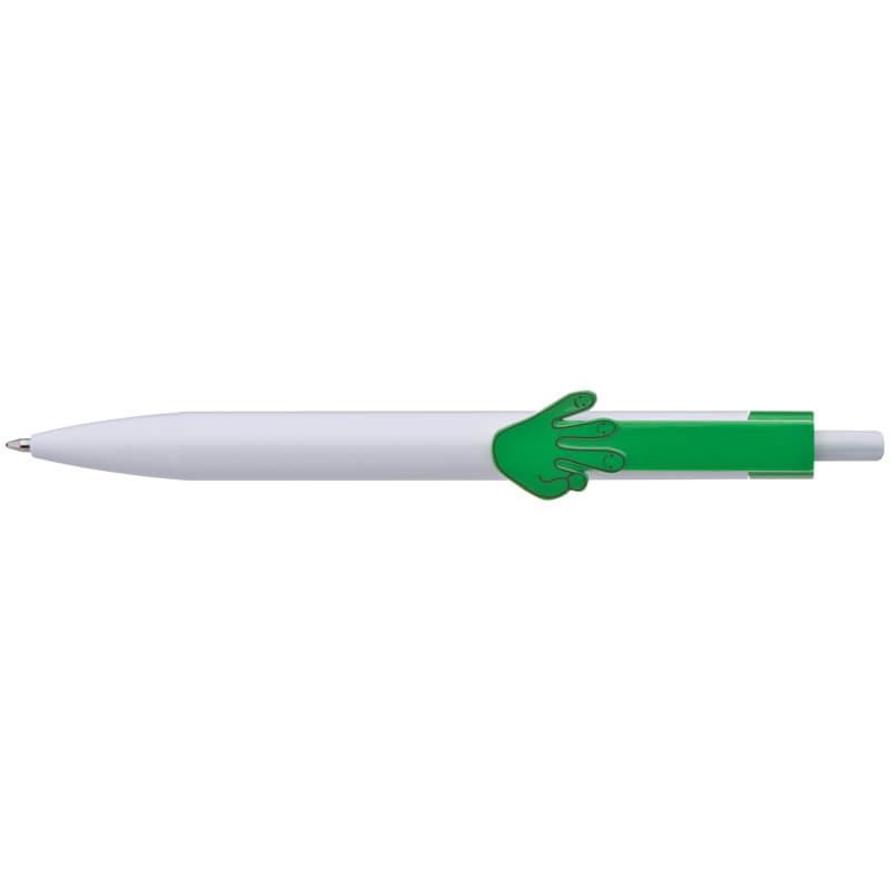 Weißer Kunststoffkugelschreiber mit farbigem Clip und blauer Schreibmine. Ihr Logo wird rechts vom Clip, auf dem Schaft oder dem Clip gedruckt.