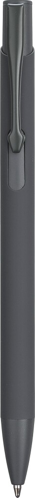 Recycled aluminum ballpoint pen with a rubberized coating on the body. The clip, tip, and pusher are in matching color. The clip is made from metal and the tip from plastic. Approx. 800 meters of writing length. Includes engraved recycled aluminum logo. Blue ink. Dimensions: 1 x 13,6 x 1,2 cm