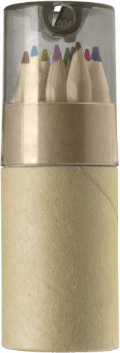 Set of 24 wood colored pencils with black finish in a tube of black cardboard.