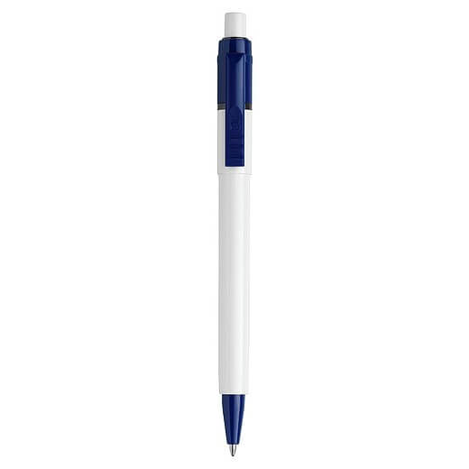 Kugelschreiber aus Kunststoff mit blauer Füllung, Metallclip und farbig gummiertem Griff. Der Körper des Stifts ist weiß.