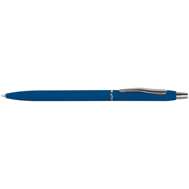 Dünner gummierter Metallkugelschreiber in verschiedenen Farben mit silbernen Applikationen und schwarzer Mine. Druckverfahren Gravur.