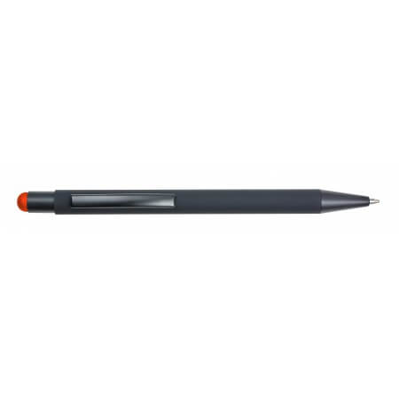 ABS and aluminium, rubberised ballpen. The inside of the barrel and the rubber stylus tip are coloured. When the pen is lasered, the imprint will show in colour. Blue ink.