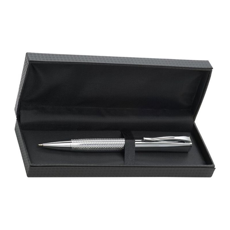 Luxus Ferraghini Kugelschreiber mit Drehmechanismus. Die Kombination aus schwarz lackierter Oberfläche und Mesh-Design wird durch Chromleisten hervorgehoben. Der blau schreibende Kugelschreiber befindet sich in einer gepolsterten Kunstledertasche mit Magnetverschluss.