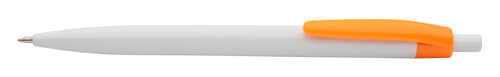 Weißer Kugelschreiber aus Kunststoff mit farbigem Clip. Mit blau schreibender Mine.