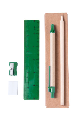 5-teiliges Büroset in Pappetui, bestehend aus: Kugelschreiber aus recyceltem Papier (blauschreibend), Bleistift, Lineal, Radierer und Anspitzer.