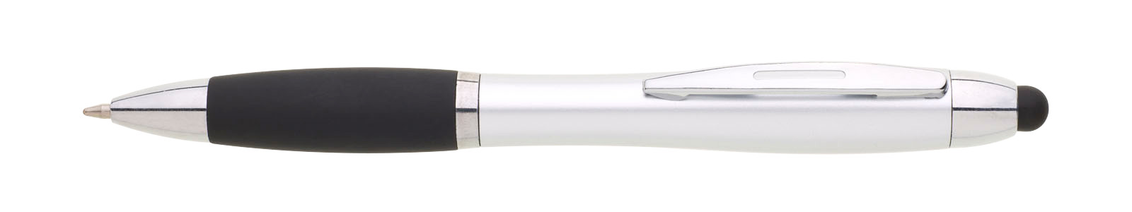 Schlanker Metallkugelschreiber mit Drehmechanismus und Spitze zur Touchscreen-Steuerung. Silberne Chrom-Accessoires, blaue Kreuzfüllung. Material Aluminium. EVERGREEN-Kollektion.