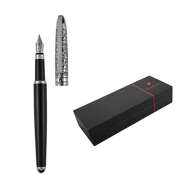 Značkové kovové plnící pero Pierre Cardin. Výrazná kombinace černého těla a stříbrného krytu s osobitým tmavým rytím latinky do povrchu. Pero obsahuje 1 ks inkoustu v modré barvě. Baleno v luxusní krabičce Pierre Cardin, dodáváno s certifikátem pravosti. Doporučená technologie tisku: laser L1. Maximální velikost tisku: 40 × 5 mm. Rozměry: plnící pero 1 × 14 cm, balení 17,5 × 6,7 × 3,5 cm. Kartonové množství v ks: 20.