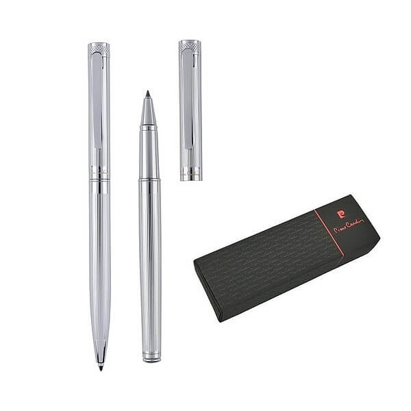 Sada značkového kuličkového pera a rolleru Pierre Cardin. Kovové tělo psacích potřeb má jemné rytí po celé délce povrchu, hrot rolleru je chráněn vrškem, kuličkové pero je navrženo s otočným mechanismem. Roller obsahuje německou náplň Schmidt® v modré barvě s hrotem 0,6 mm, kuličkové pero kvalitní modrou náplň s hrotem 1 mm. Roller i kuličkové pero jsou dodávány s náhradní černou náplní. Baleno v luxusní krabičce Pierre Cardin, dodáváno s certifikátem pravosti. Doporučená technologie tisku: laser L1. Maximální velikost tisku: 25 × 4 mm. Rozměry: kuličkové pero 1,2 × 14,2 cm, roller 1,2 × 14 cm, balení 17,5 × 5,5 × 3,5 cm. Kartonové množství v ks: 20.