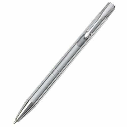 Kugelschreiber aus Metall mit blau schreibender Mine.
