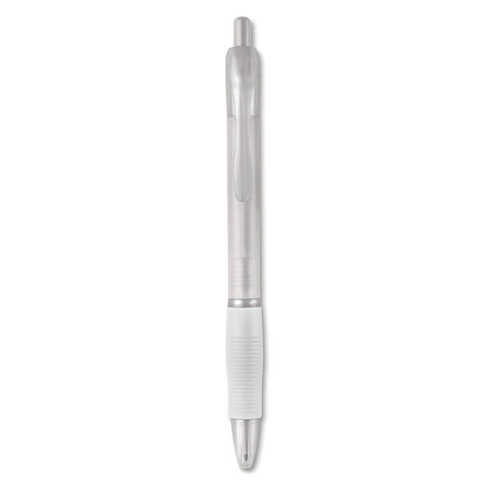 Kugelschreiber aus recyceltem Kunststoff mit gummiertem Schaft und Griff aus TPR. Tintenfarbe: Blau. Schreiblänge: 1000 Meter. Strichstärke: 1,0 mm. Recycelter ABS Kunststoff.