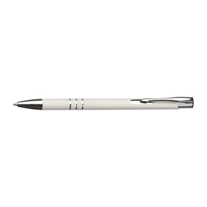 Dünner, schlichter Kugelschreiber in Weiß mit gummiertem Schaft und verchromtem Zubehör. Blaue Mine X-20. X-20