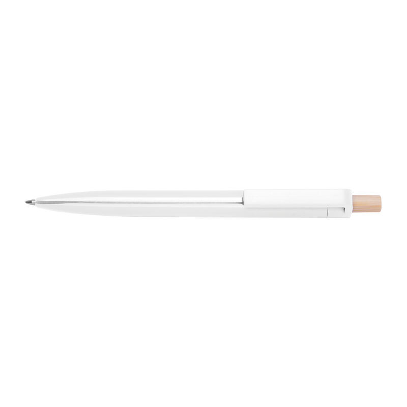 Trendiger Kugelschreiber mit Knopf und blauer Mine. Da der Stiftkörper weiß ist, wird der Farbclip noch deutlicher.