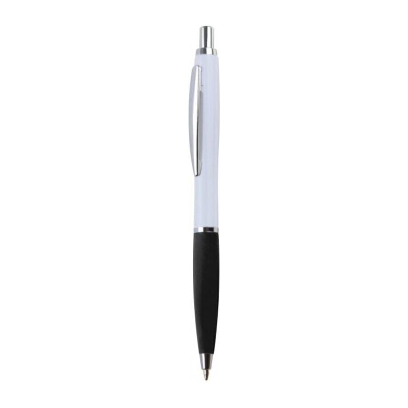 Kugelschreiber aus Kunststoff mit blauer Füllung zum Schreiben. Weißer Körper, farbiger Clip und farbiges Griffteil.
