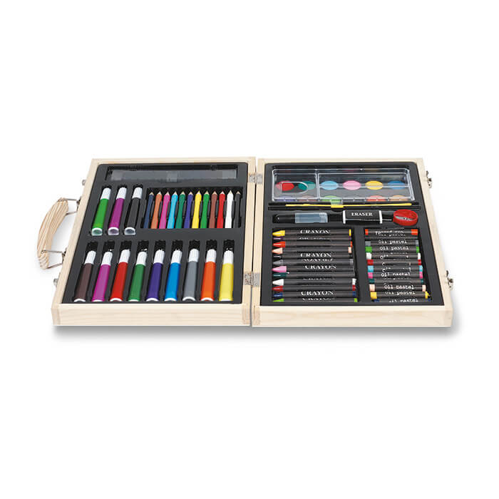 Art set containing 10 colored pencils, 8 water color paints with brush. Packed in kraft paper box.