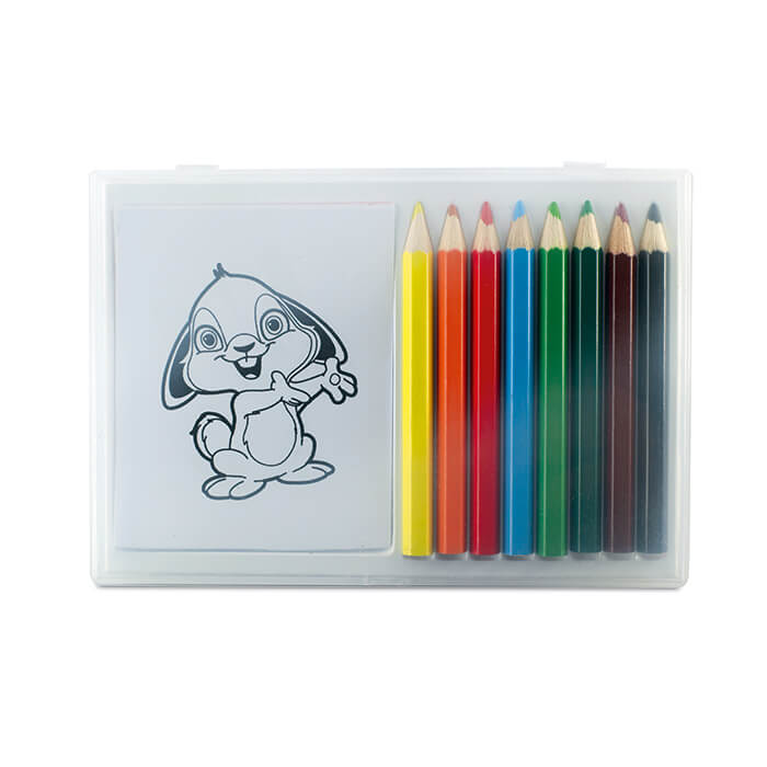 Zeichen-Set mit 6 Buntstiften, Spitzer und Malbuch.