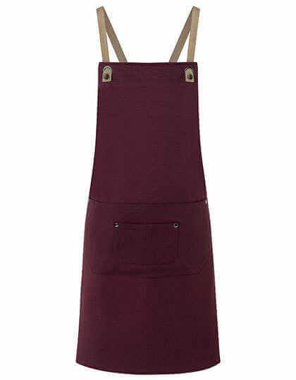 215 g/qm, 65% Polyester (recycelt), 35% Baumwolle (Twill), kontrastierende, natürlich wirkende Träger, Träger werden zur Entlastung des Nackens über den Schultern getragen, funktioneller Verschluss: die kontrastierenden Träger am Rücken kreuzen, durch die Schnallen ziehen und dann binden (flexible Länge und Höhe), moderne, abgeschrägte Kanten an den Enden der Schürze, farbecht, pflegeleicht, nachhaltig, Maße: 70 x 85 cm