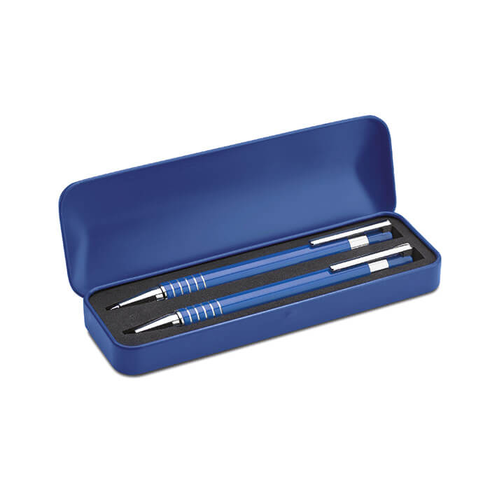 Aluminum ballpoint pen set with blue refill and 0.7 mm rigid mechanical pencil in paper gift box.