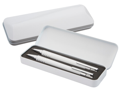Kugelschreiber und Druckbleistift aus Metall (mit 0,7 mm Bleimine) im Metalletui. Mit blau schreibender Mine.