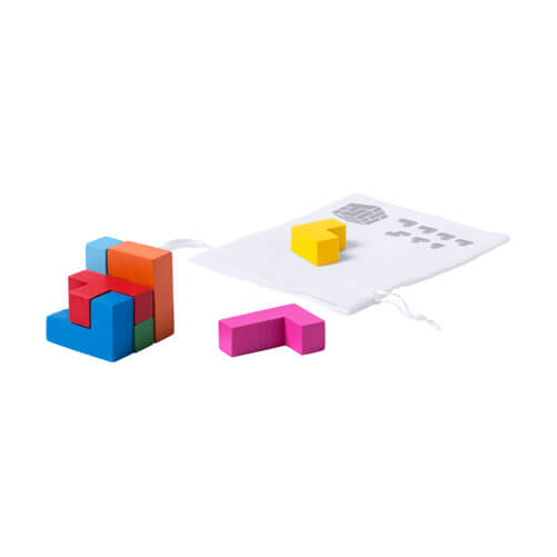 Puzzle aus Holz, welches ein Würfel formt, farbig, in naturfarbigem Non-Woven Beutel (123x150 mm).