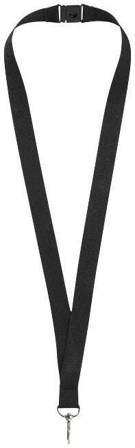 Schlüsselband aus Polyester mit Karabinerhaken aus Metall.