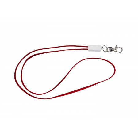 TPE lanyard and charging cable in one, with a USB and micro USB connection. The micro USB plug doubles as a lightning connector when flipped around. The square closure has a metal carabiner hook. Cable length: approx. 90 cm.