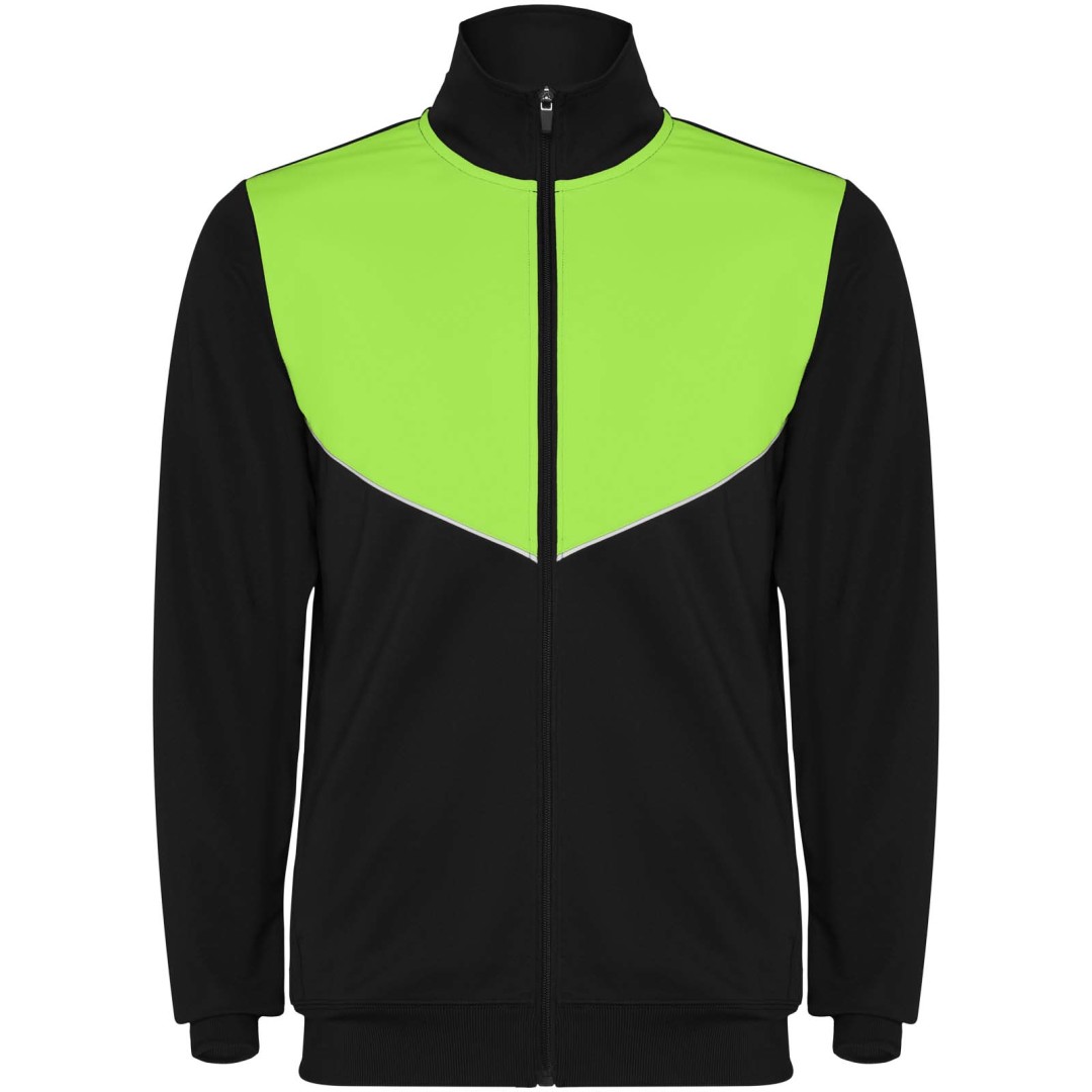 Trainingsanzug aus leichtem und elastischem Stoff. Jacke mit Kontrastfarbe und genähtem Saum auf der Brust. Hoher Kragen mit Kontrastnähten. Reißverschluss vorne in der Mitte. Seitentaschen. 2 x 2 Rippbündchen an Ärmeln und Taille. Hose mit elastischem Bund und Kordelzug. Kontrastierendes Seitenteil mit genähtem Saum. Reißverschluss am Saum.