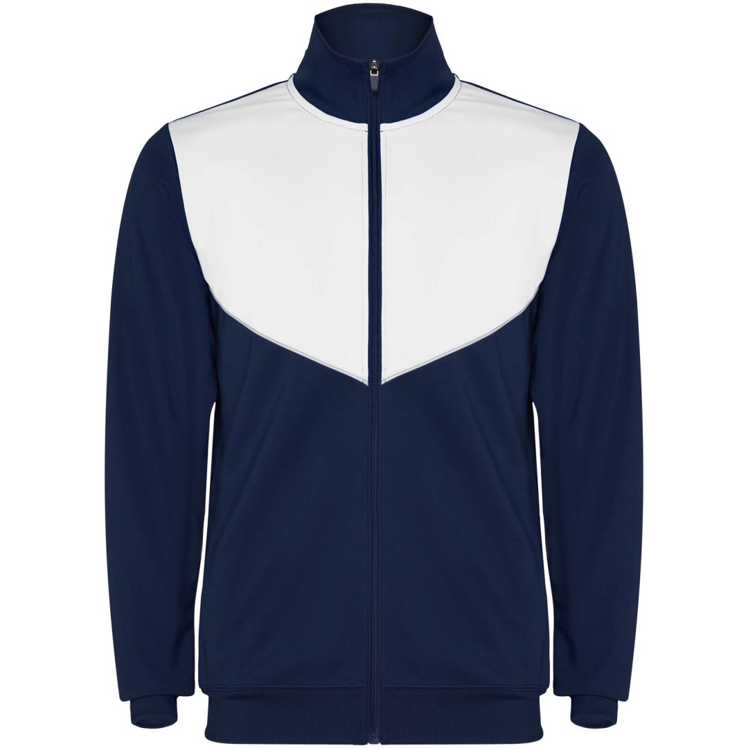 Trainingsanzug aus leichtem und elastischem Stoff. Jacke mit Kontrastfarbe und genähtem Saum auf der Brust. Hoher Kragen mit Kontrastnähten. Reißverschluss vorne in der Mitte. Seitentaschen. 2 x 2 Rippbündchen an Ärmeln und Taille. Hose mit elastischem Bund und Kordelzug. Kontrastierendes Seitenteil mit genähtem Saum. Reißverschluss am Saum.