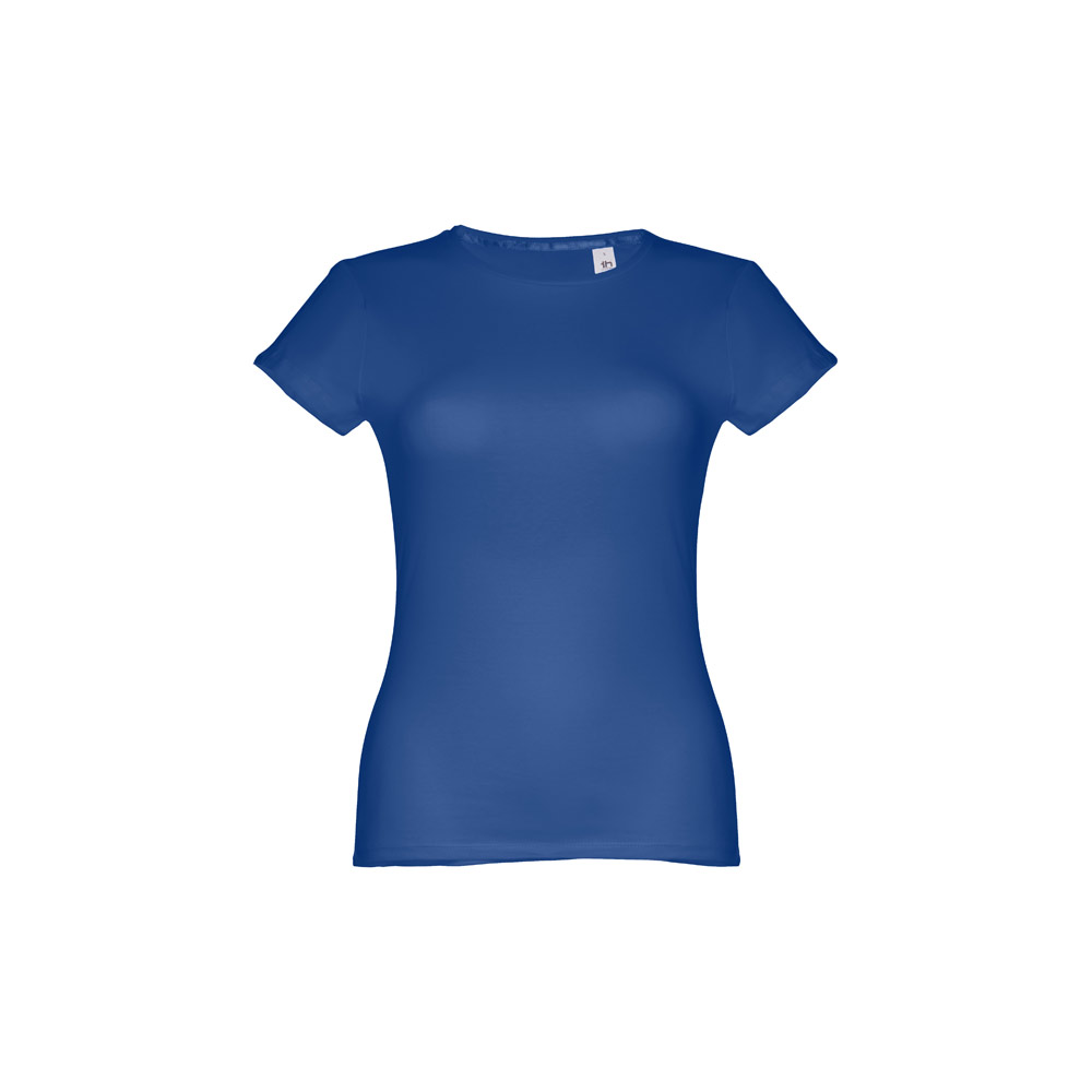 Damen T-shirt aus 100% Baumwolljersey (150 g/m²). Farbe 83: 90% Baumwolle/10% Viskose. Schmaler Jersey-Kragen mit Satin-Verstärkungsband. Doppelnaht an Ärmeln und Saum. Tailliert.
