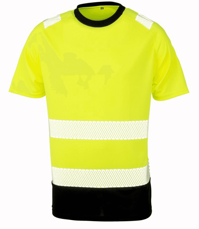 Recyceltes Sicherheits-T-Shirt, 155 g/m², 100 % Polyester (recycelt), Kragen: 100 % Polyester, abgesteppte Schulter- und Ärmeldetails, aufgedruckte Sicherheitsbänder, kontrastierende schwarze Einsätze und Kragen, gerippter Stretch-Kragen, dunkles Design am unteren Rand zum Abdecken von Schmutz, EN ISO 20471:2013 + A1:2016 Klasse 2 (Fluo Orange) RIS-3279-TOM Klasse 2 (Fluo Orange).
