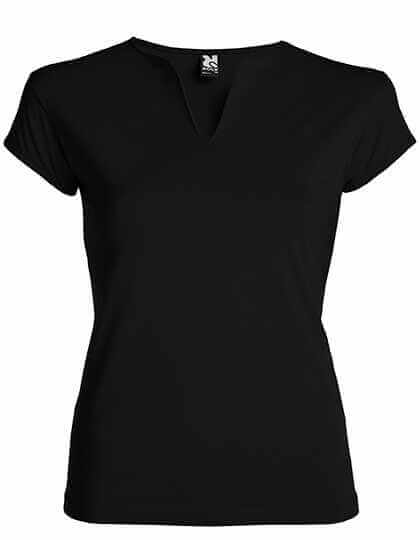 Damen-T-Shirt mit kurzen Ärmeln und figurbetontem Kragen. Der hintere Saum ist etwas länger als der vordere. Die Seitennähte sind nach vorne versetzt.