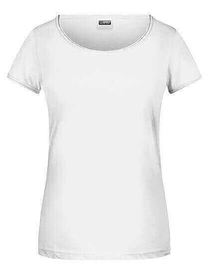 Gekämmte, ringgesponnene Bio-Baumwolle, Single-Jersey | Tief ausgeschnittener Rundhalsausschnitt und Ärmel mit Rollsaum | Tear off!® Label | Leicht tailliert